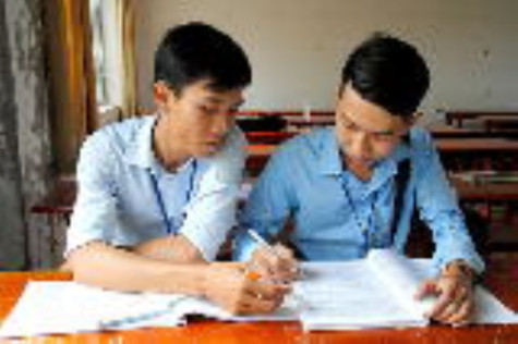 | Lê Toàn Đỉnh và Lâm Thế Bảo tranh thủ giờ ra chơi trao đổi bài để chuẩn bị cho tiết học mới.. |
