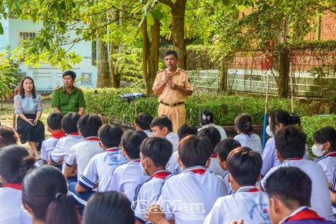 | Phòng Cảnh sát giao thông (Công an tỉnh) tuyên truyền về trật tự ATGT và những quy định có liên quan tại Trường Phổ thông Dân tộc Hữu Nhem, huyện Thới Bình. |