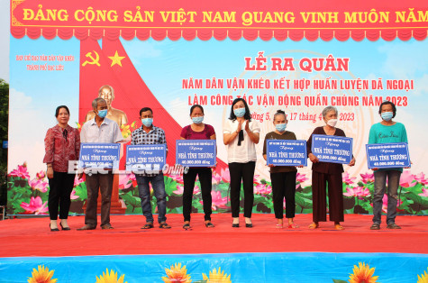TP. Bạc Liêu hỗ trợ người dân có hoàn cảnh khó khăn xây dựng nhà tình thương tại lễ ra quân Năm Dân vận khéo. Ảnh: T.T