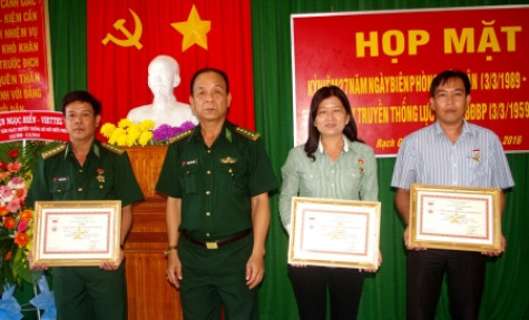 | Ðại tá Lương Hoàng Ðông, Chỉ huy trưởng Bộ đội Biên phòng tỉnh Cà Mau trao Kỷ niệm chương cho cán bộ địa phương có nhiều thành tích trong công tác bảo vệ biên giới tại Ðồn Biên phòng Rạch Gốc. |