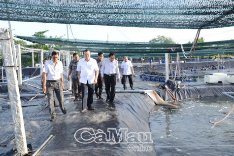 Phó Bí thư Thường trực Tỉnh uỷ Phạm Bạch Đằng tham quan mô hình nuôi tôm siêu thâm canh xã Hoà Tân, thành phố Cà Mau