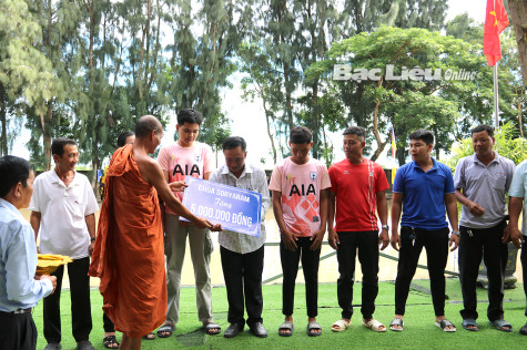 Trụ trì chùa Soryaram (xã Hưng Hội, huyện Vĩnh Lợi) hỗ trợ kinh phí hoạt động cho Tổ tự quản về an ninh trật tự. Ảnh: T.H