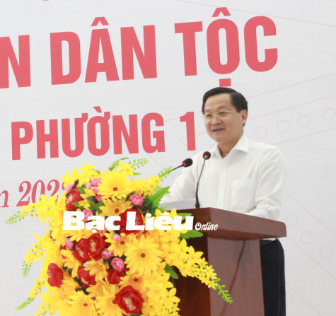 Bí thư Trung ương Đảng, Phó Thủ tướng Chính phủ - Lê Minh Khái phát biểu tại Ngày hội Đại đoàn kết toàn dân tộc khu dân cư khóm 1 (Phường 1, TX. Giá Rai). Ảnh: N.Q