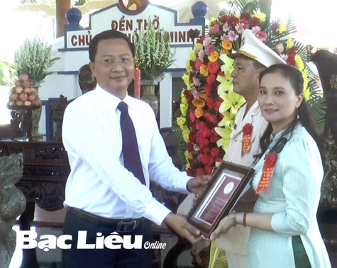 Đồng chí Trương Thanh Nhã - Bí thư Huyện ủy Vĩnh Lợi trao bằng tuyên dương cho đồng chí Ngô Thị Tú Anh. Ảnh: M.Đ