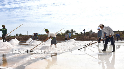 Diêm dân tăng thu nhập nhờ chuyển đổi từ sản xuất muối truyền thống sang sân trải bạt ở xã Điền Hải (huyện Đông Hải). Ảnh: K.T
