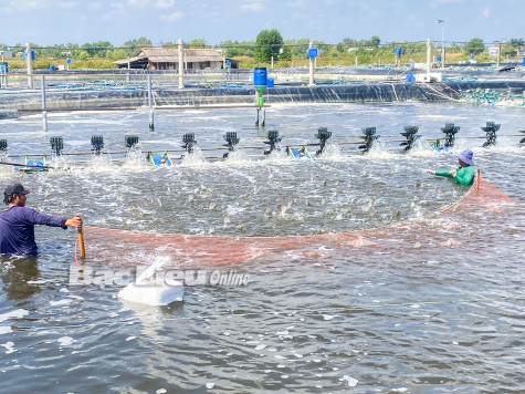Thu hoạch tôm nuôi công nghiệp. Ảnh: T.A