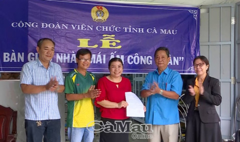 Ông Trần Thanh Phong, Chủ tịch CÐVC tỉnh Cà Mau (thứ 2 bên phải) trao nhà Mái ấm Công đoàn cho đoàn viên CÐCS báo Cà Mau.