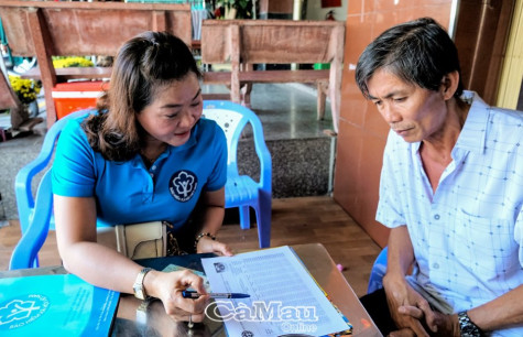 | Bà Mai Thị Thanh Phong, Phó Trưởng phòng truyền thông, BHXH (bên trái) tuyên truyền chính sách BHXH, BHYT cho các hộ dân trên địa bàn TP Cà Mau. |