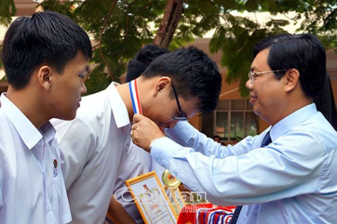 Chủ tịch UBND tỉnh Cà Mau Nguyễn Tiến Hải khen thưởng học sinh trường THPT Chuyên Phan Ngọc Hiển đoạt giải cao tại Trại hè Phương Nam năm 2018. |