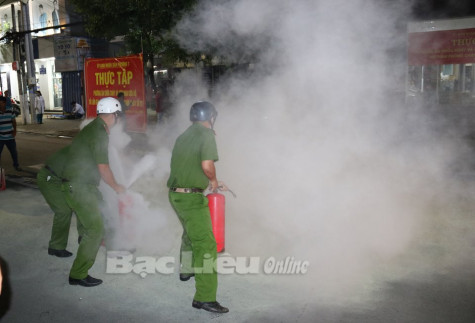 Lực lượng chữa cháy tiến hành dập tắt đám cháy tại buổi thực tập ở Phường 7 (TP. Bạc Liêu).