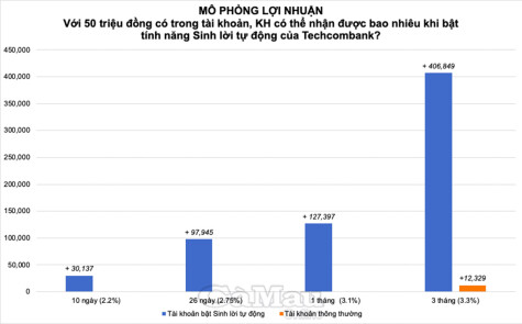 Thị trường ngân hàng Việt Nam cũng đã chứng kiến sự bùng nổ của tính năng “sinh lời tự động”. Ðiển hình là Ngân hàng TMCP Kỹ thương Việt Nam (Techcombank) với “Tài khoản thanh toán Techcombank - Kỷ nguyên sinh lời tự động”, ra mắt từ tháng 11/2023. Tính năng này giúp khách hàng tận dụng khoản tiền nhàn rỗi trong tài khoản giao dịch để tạo ra lợi nhuận hằng ngày. Số dư trong tài khoản vượt quá 10 triệu đồng sẽ được chuyển vào số dư sinh lời tự động với lãi suất lên đến 3.3%/năm, tuỳ thuộc vào chính sách từng thời kỳ của Techcombank. Ðiều đặc biệt là khách hàng có thể linh hoạt điều chỉnh ngưỡng tiêu chuẩn này thông qua ứng dụng Techcombank Mobile.