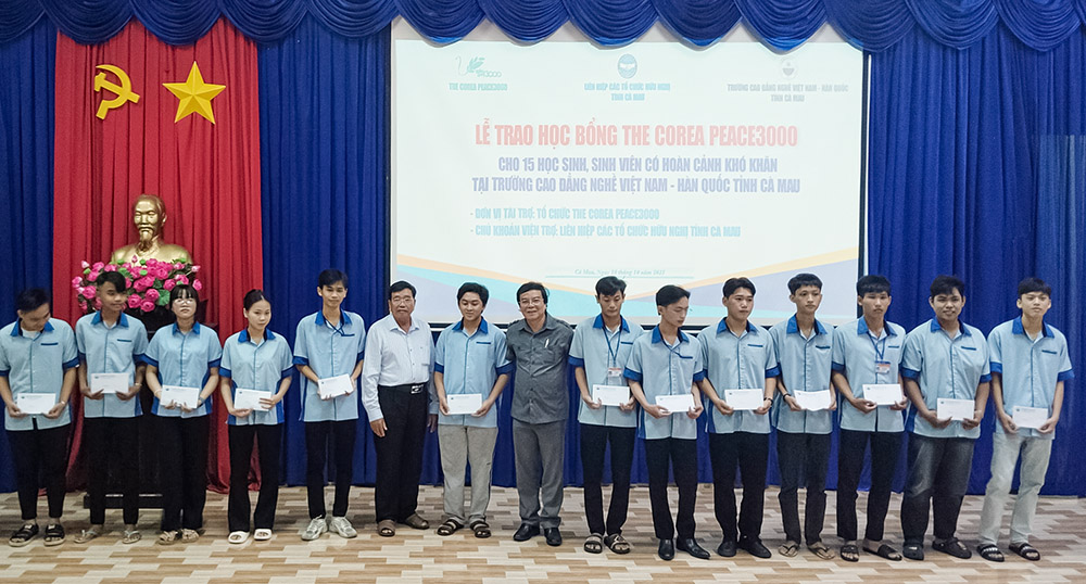 Liên hiệp Các tổ chức hữu nghị tỉnh trao học bổng The Corea Peace3000 cho học sinh, sinh viên Trường Cao đẳng Nghề Việt Nam - Hàn Quốc Cà Mau, ngày 10/10/2025. (Ảnh đơn vị cung cấp)