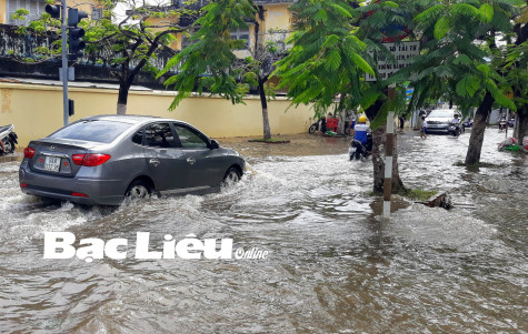 Mưa lớn cộng với triều cường dâng làm ngập cục bộ một số tuyến đường trong nội ô TP. Bạc Liêu. Ảnh: M.Đ
