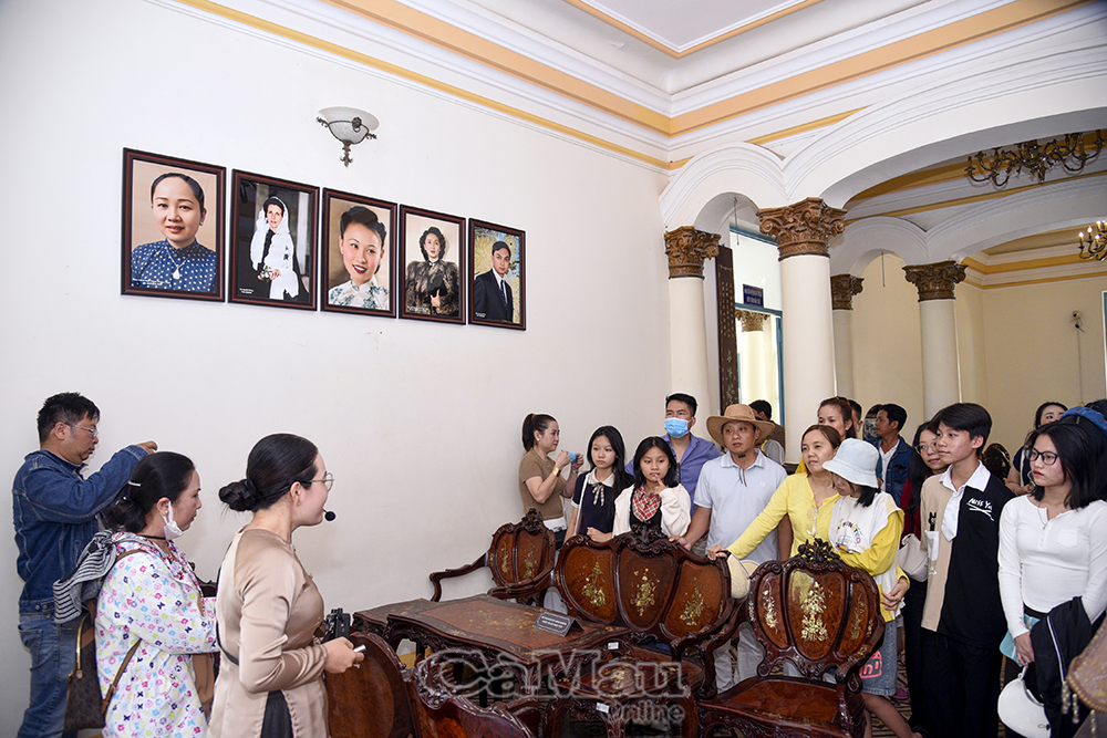 Du khách tham quan ngôi nhà cổ và nghe thuyết minh giai thoại về Công tử Bạc Liêu.
