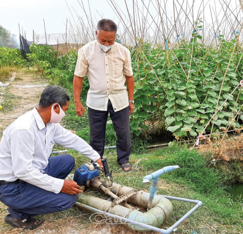 Nước ở kênh mương do mùa hạn nên nhanh rút, mỗi lần tưới xong ông phải bơm nước ngầm tăng cường. Máy cứ thế tự chạy phun đều nước các gốc dưa leo, chạy đến cuối đoạn kênh sẽ quay trở lại tưới thêm một lần nữa là kết thúc, tiếp tục được chuyển qua đoạn kênh thứ hai.