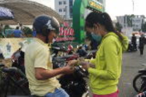 Nhân viên giữ xe thu tiền của khách đến xem với giá giữ xe máy 5.000 đồng/chiếc.