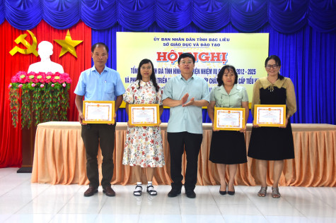 Dịp này, Sở GD-ĐT đã khen thưởng cho 4 tập thể và 21 cá nhân hoàn thành tốt nhiệm vụ trong triển khai thực hiện thí điểm loại hình trường, lớp CLC cấp tiểu học và THCS trên địa bàn tỉnh Bạc Liêu giai đoạn 2012 - 2025 (ảnh).