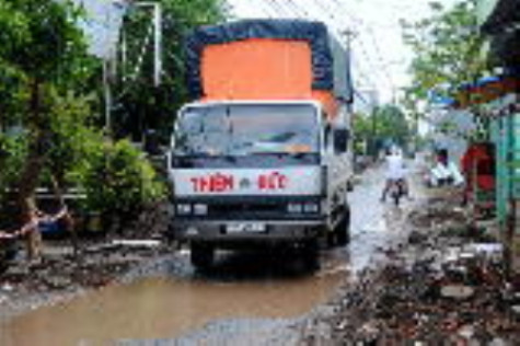 | Xe tải lưu thông thường xuyên làm cho con đường xuống cấp nghiêm trọng. |