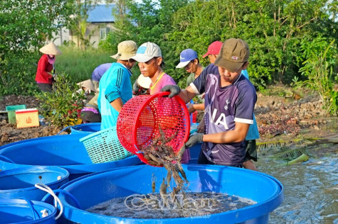 | Năm 2019, sản lượng tôm của huyện đạt trên 16.500 tấn, năng suất bình quân 330 kg/ha, tăng 9,46 kg/ha so với năm 2018. (Trong ảnh: Nông dân Ấp 9, xã Trí Lực thu hoạch tôm càng xanh). |