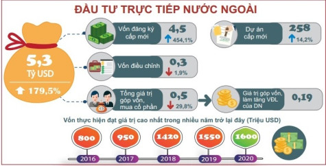 Tổng vốn đầu tư nước ngoài vào Việt Nam tính đến 20/1/2020 bao gồm vốn đăng ký cấp mới, vốn đăng ký điều chỉnh và giá trị góp vốn, mua cổ phần của nhà đầu tư nước ngoài đạt 5,3 tỷ USD, tăng 179,5% so với cùng kỳ năm 2019.