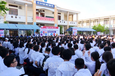 | Qua 2 buổi triển khai chương trình đến thời điểm này đã có hơn 3.400 em học sinh của trường THPT Cà Mau được cập nhật kiến thức “An toàn giao thông cho nụ cười ngày mai”. |