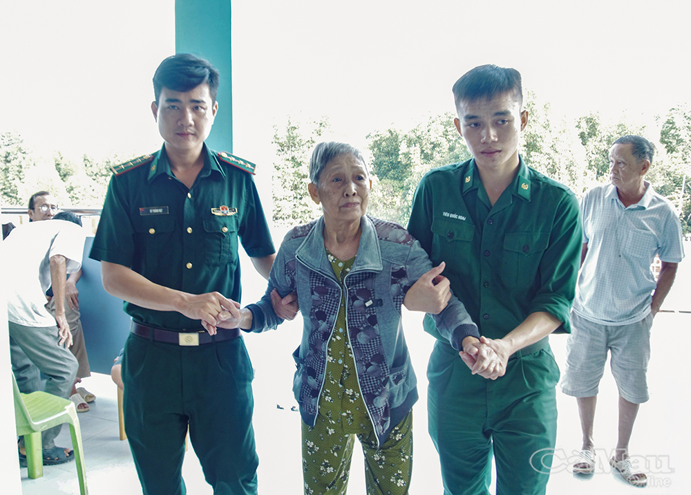 Chiến sĩ Đồn Biên phòng Rạch Gốc hỗ trợ người cao tuổi đến khám mắt miễn phí.