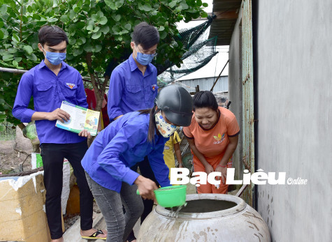 Đoàn viên - thanh niên TP. Bạc Liêu tuyên truyền, giúp người dân xúc lu nước để diệt lăng quăng, phòng chống sốt xuất huyết. Ảnh: H.T