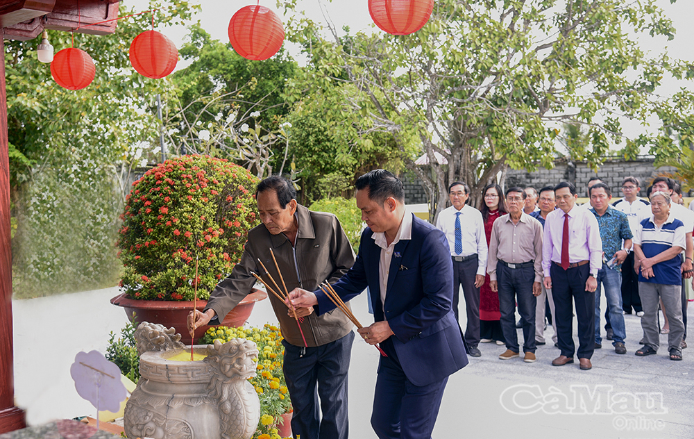 Trước lễ khai mạc triển lãm, ông Đỗ Ngọc Ẩn, Chủ tịch Liên hiệp các Hội Văn học - Nghệ thuật tỉnh Cà Mau (bên trái) và Tiến sĩ Trịnh Hồng Lanh, Trưởng khoa Mỹ thuật công nghiệp, Trường Đại học Cửu Long, cùng các đại biểu dâng hương tưởng niệm cố nhạc sĩ Cao Văn Lầu.