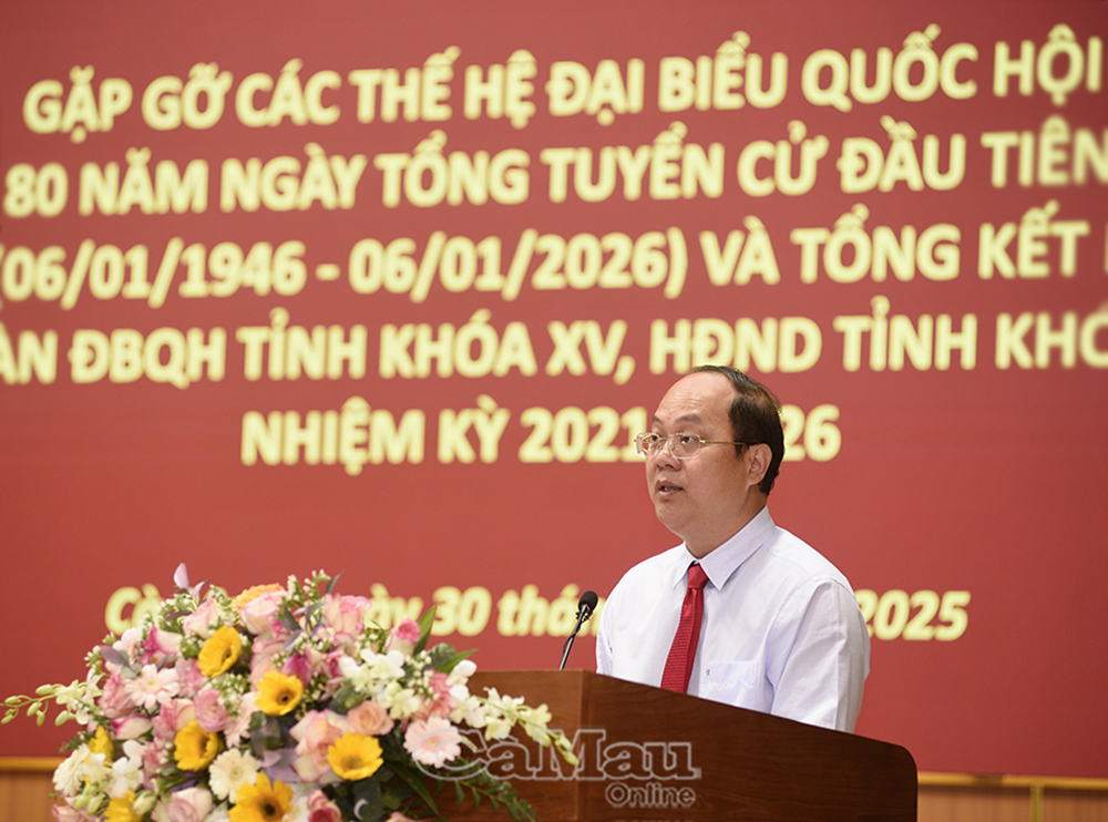 Chiều 30/12, Đoàn đại biểu Quốc hội, HĐND và UBND tỉnh Cà Mau tổ chức buổi gặp gỡ các thế hệ đại biểu Quốc hội nhân kỷ niệm 80 năm Ngày Tổng tuyển cử đầu tiên bầu Quốc hội Việt Nam (6/1/1946-6/1/2026), đồng thời tổng kết hoạt động của Đoàn ĐBQH khoá XV và HĐND tỉnh Cà Mau khoá X, nhiệm kỳ 2021-2026.