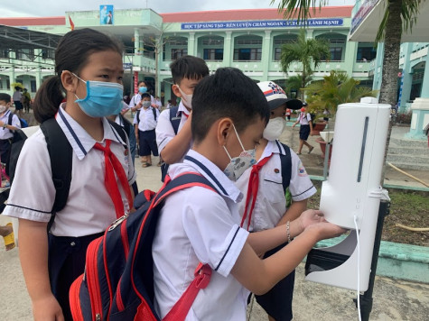 Học sinh Trường tiểu học xã Vĩnh Phú Tây (huyện Phước Long) tự đo thân nhiệt, sát khuẩn tay trước khi vào lớp.