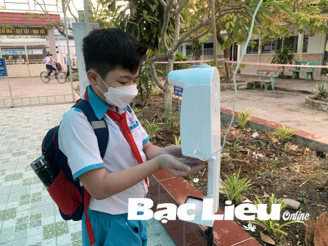 Học sinh Trường TH Hòa Bình A (TT. Hòa Bình, huyện Hòa Bình) sát khuẩn tay, đo thân nhiệt vào sáng ngày 14/2/2022.