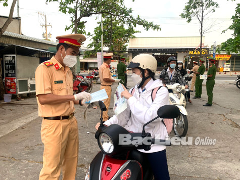 Công an huyện Hòa Bình phát khẩu trang, tuyên truyền phòng chống dịch bệnh COVID-19 cho học sinh lớp 12 Trường THPT Lê Thị Riêng.