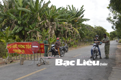 Lực lượng chức năng xã Vĩnh Trạch Đông (TP. Bạc Liêu) kiểm tra việc đi lại của người dân trong vùng cấp độ 4.