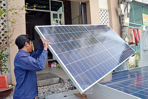 | Công ty Điện lực Cà Mau lắp đặt điện mặt trời cho hộ dân ở Phường 7, TP Cà Mau.Ảnh: Nguyễn Phú |