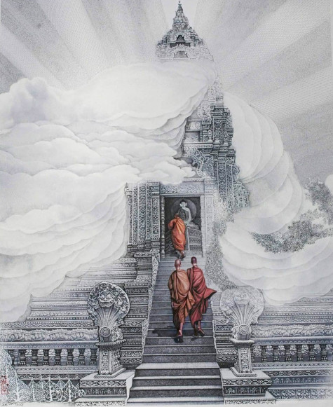 | Tác phẩm “Cõi thiêng” – chất liệu bút sắt của Hoạ sĩ Lại Lâm Tùng. |