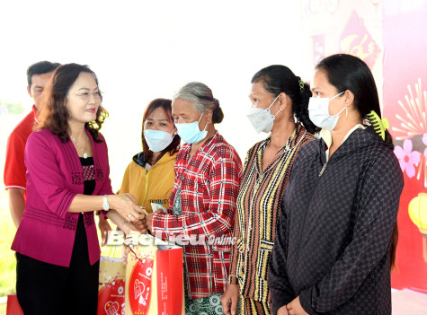 Phó Bí thư Thường trực Tỉnh ủy - Lê Thị Ái Nam tặng quà cho hộ Khmer nghèo ở xã Hưng Hội (huyện Vĩnh Lợi). Ảnh: H.T