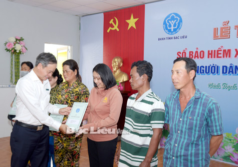 Ngân hàng BIDV - Chi nhánh Bạc Liêu tặng sổ bảo hiểm xã hội cho hộ nghèo xã Vĩnh Trạch Đông (TP. Bạc Liêu) - địa bàn có nhiều hộ nghèo thiếu hụt tiêu chí bảo hiểm y tế. Ảnh: H.T