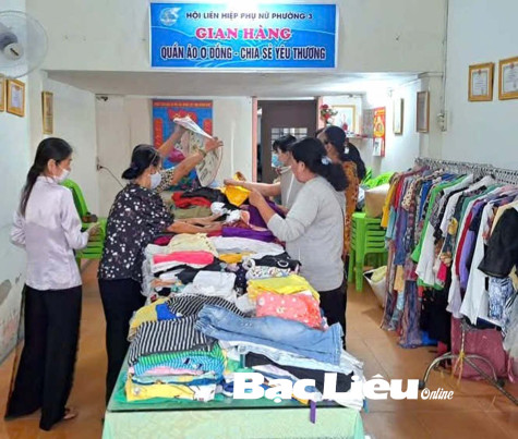 Hội LHPN Phường 3 (TP. Bạc Liêu) tiếp nhận và sắp xếp gian hàng quần áo 0 đồng. Ảnh: T.L