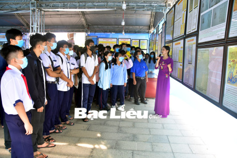 Học sinh, thanh thiếu niên TP. Bạc Liêu tham quan, tìm hiểu triển lãm bản đồ và trưng bày tư liệu “Hoàng Sa, Trường Sa của Việt Nam - Những bằng chứng lịch sử và pháp lý”.