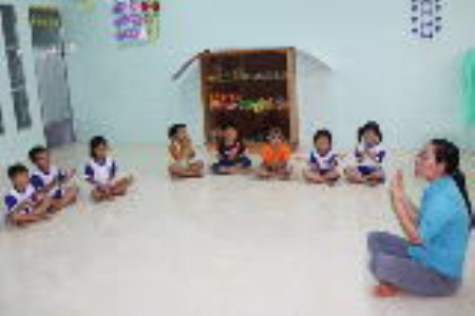 Cô và trò Trường Mẫu giáo Bông Hồng trong giờ sinh hoạt. |
