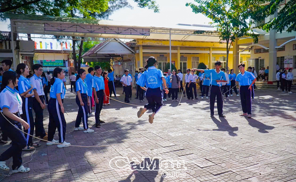 Trong những giờ ra chơi ấy, sân trường Trường THPT Đầm Dơi không còn cảnh học sinh tụ tập lặng lẽ bên màn hình điện tử. Thay vào đó là không khí nhộn nhịp của các hoạt động vui chơi, vận động tập thể. Tại khu vực sân chính, trò chơi kéo co thu hút đông đảo học sinh tham gia với tinh thần hào hứng, thi đua sôi nổi. Những tiếng hò reo, cổ vũ vang lên đã tạo nên bầu không khí vui tươi, gắn kết giữa các lớp, các khối.