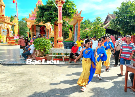 Các bạn trẻ đồng bào dân tộc Khmer trong trang phục dân tộc đến “trẩy hội” tại chùa Xiêm Cán. Ảnh: Đ.K.C