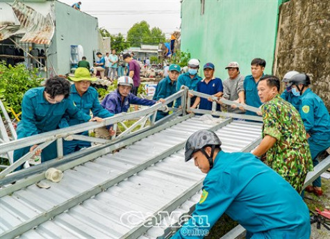 Lực lượng dân quân, dân phố của Tp. Cà Mau và phường 6 cùng với người dân khắc phục thiệt hại ban đầu. Ảnh: Nhật Minh