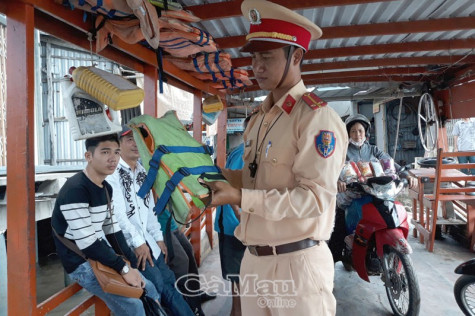 | Lực lượng cảnh sát giao thông huyện Ngọc Hiển thường xuyên kiểm tra các bến phà, đò đưa rước khách ngang sông. |