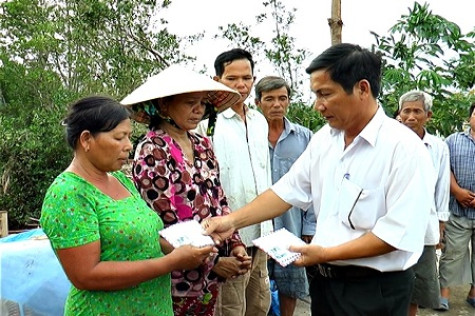 | Phó Chủ tịch UBND huyện Thái Hoàng Bo hỗ trợ cho hộ dân bị sập nhà tại ấp Nam Chánh, xã Tân Dân. |