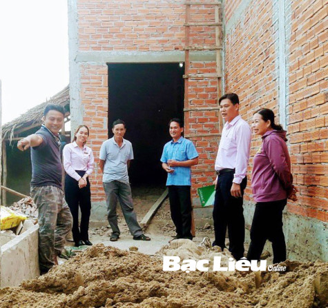 Đại diện Phòng giao dịch Ngân hàng Chính sách xã hội huyện Hồng Dân theo dõi tiến độ xây nhà của các hộ vay vốn. Ảnh: T.L