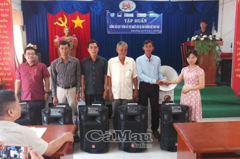 | Chị Bùi Thị Minh Thuỷ, cán bộ dự án của Trung ương Hội LHPN, hỗ trợ loa cho 10 ấp của xã Khánh An và 15 ấp của xã Khánh Hưng. |