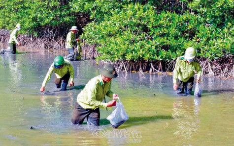 | Thời gian qua, tỉnh triển khai nhiều chương trình, dự án và các lực lượng cùng nỗ lực khôi phục đai rừng phòng hộ, ứng phó tác động biến đổi khí hậu. (Trong ảnh: Lực lượng kiểm lâm thuộc Ban Quản lý rừng phòng hộ biển Tây thu lượm trái đước, trồng tại những vị trí có khoảng trống ven đê). |
