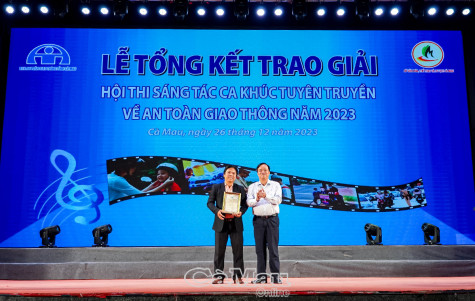 Chủ tịch UBND tỉnh Huỳnh Quốc Việt, Trưởng Ban ATGT tỉnh, trao thưởng cho tác giả đoạt giải A Hội thi Sáng tác ca khúc tuyên truyền về ATGT.