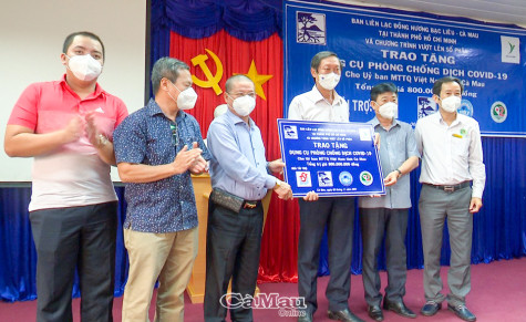 | Ban Liên lạc Đồng hương Bạc Liêu - Cà Mau tại TP Hồ Chí Minh và Chương trình “Vượt lên số phận” trao tặng dụng cụ phòng, chống dịch Covid-19 cho Uỷ ban MTTQ Việt Nam tỉnh Cà Mau, ngày 6/11/2021. (ảnh minh hoạ) |